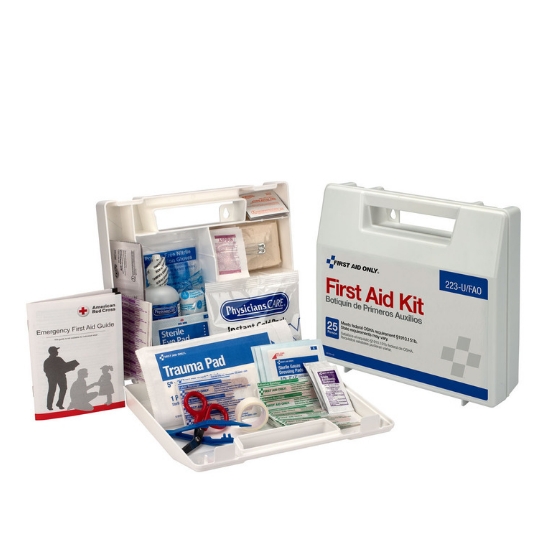 Este kit de primeros auxilios de 107 piezas es ideal para contratistas, vehículos de flota, lugares de trabajo o pequeñas empresas con hasta 25 empleados. Cumple con las recomendaciones federales de OSHA y ofrece 17 productos críticos, incluyendo 4 onzas. lavado de ojos La caja de plástico dividida y resistente al agua se puede montar en la pared pero tiene un asa para facilitar su transporte.
