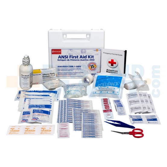 - Este kit de primeros auxilios a granel de 110 piezas y 25 personas está diseñado para usarse en oficinas pequeñas, vehículos y sitios de trabajo. La caja de plástico dividida y resistente al agua se puede montar en la pared, pero tiene un asa para facilitar su transporte.