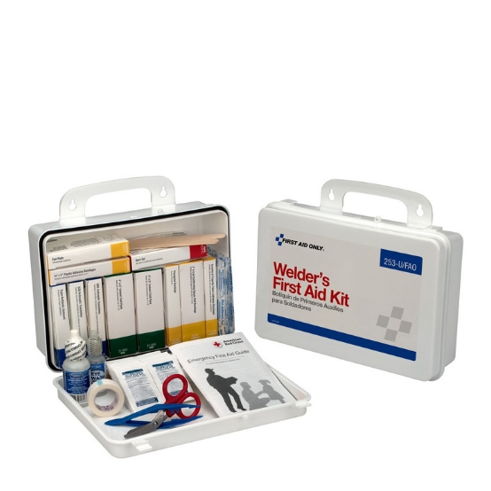 Trabajadores de fuerza industrial merecen cuidado de fuerza industrial. El kit de primeros auxilios de este soldador de 113 piezas y 16 unidades se enfoca en una amplia gama de lesiones comunes a los soldadores, como cortes menores, esguinces, arco de soldador y otras irritaciones comunes en los ojos. Los productos están contenidos en una caja de plástico resistente con junta.