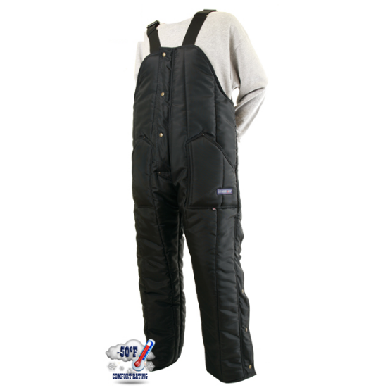 Par de pantalones con gran altura extra en la parte delantera y trasera. Cremallera lateral en la pierna para facilitar el encendido / apagado. Correas de hombro ajustables elásticas de 2
