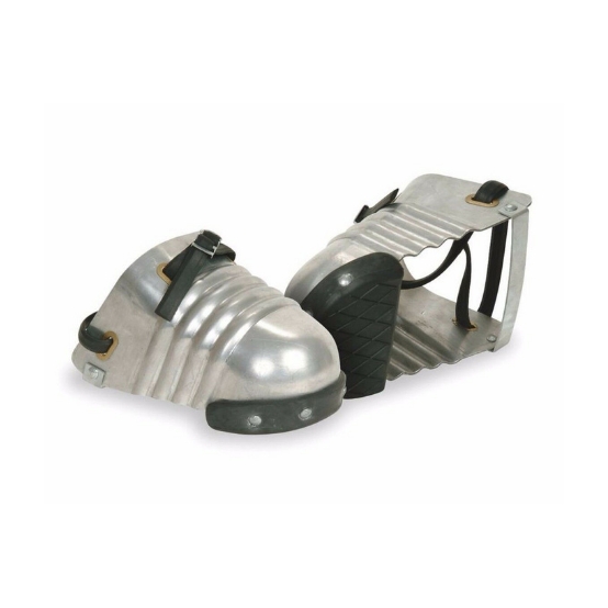Los protectores de los pies son protectores metálicos que se colocan sobre los zapatos para brindar máxima protección a todo el pie, tanto el empeine como los dedos, contra la caída, rodadura, objetos voladores o golpes accidentales con las herramientas. Están diseñados para resistir un impacto de 75 pies libras, con un gran factor de seguridad diseñado. Los protectores para pies se adaptan a cualquier zapato (sin derechos o izquierdas), con 5 pulgadas (promedio) y 5 y 1/2 pulgadas ( grandes) anchos. Son lo suficientemente livianos para ser usados ??cómodamente todo el día. Para mantener el protector correctamente colocado, tiene una pinza de goma, una barra transversal y una correa de goma de una sola pieza con una hebilla de tensión, o una correa de cuero de dos piezas con un dispositivo de cierre de resorte. Según las regulaciones federales, los guardias brindan una protección igual a los estándares AIMSI-Z41.