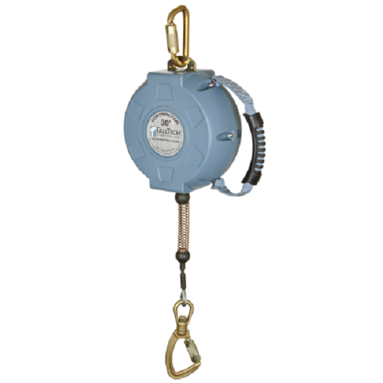 SRL con carcasa de nylon rellena de vidrio; 1 mosquetón de conexión y 1 mosquetón giratorio que indica carga.